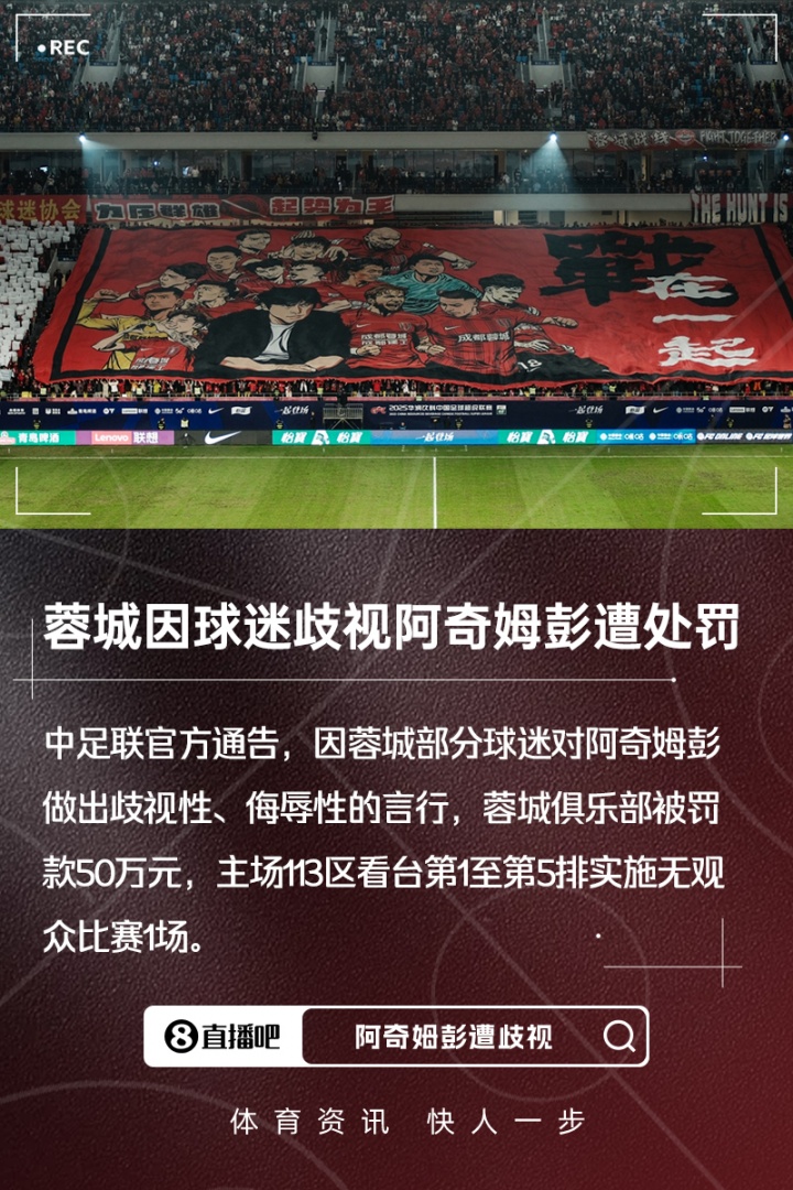 11月22日讯 中足联官方发布公告,因蓉城部分球迷对阿奇姆彭作念出烦恼性、侮辱性的言行,蓉城俱乐部被罚金50万元,部分看台空场。