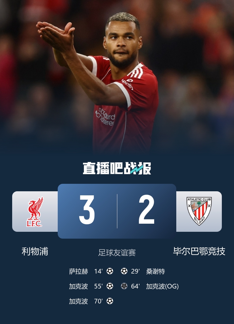 友谊赛第二场,利物浦3-2打败毕巴,赤军在此次邻接2场的友谊赛收场双杀。