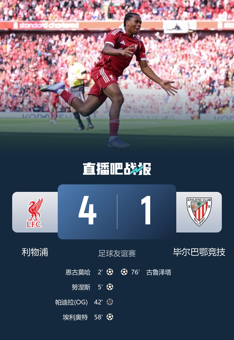 利物浦与毕巴进行邻接热身赛,首场对决,利物浦4-1取胜,恩古莫哈、努涅斯与埃利奥特获取进球。