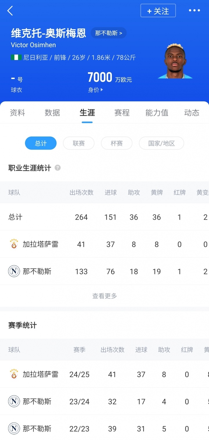 奥斯梅恩,现年26岁,尼日利亚时尚,2020年冬窗那不勒斯破耗7890万欧从里尔引进球员。上赛季奥斯梅恩被外租至加拉塔萨雷,出战41场比赛,孝敬37球8助。球员当今德回身价7000万欧,巅峰曾达到1.2亿欧。