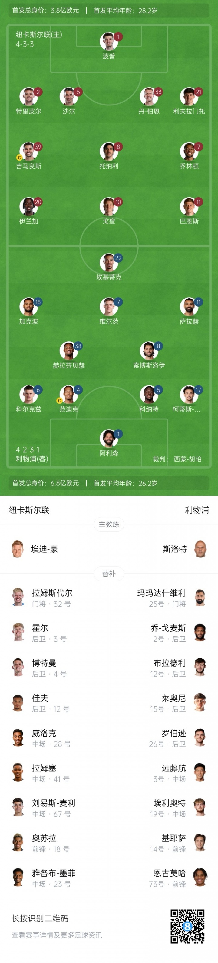 利物浦vs纽卡首发:萨拉赫、维尔茨、埃基蒂克先发,伊萨克缺阵