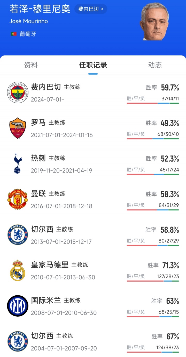 穆里尼奥握教费内巴切战绩: