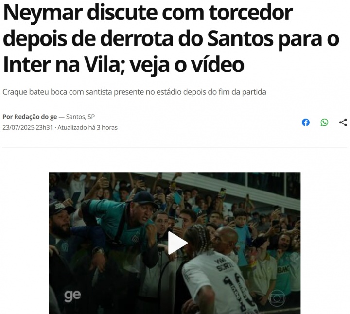 巴媒:桑托斯输球后,内马尔与别称看台上的球迷发生横暴争持