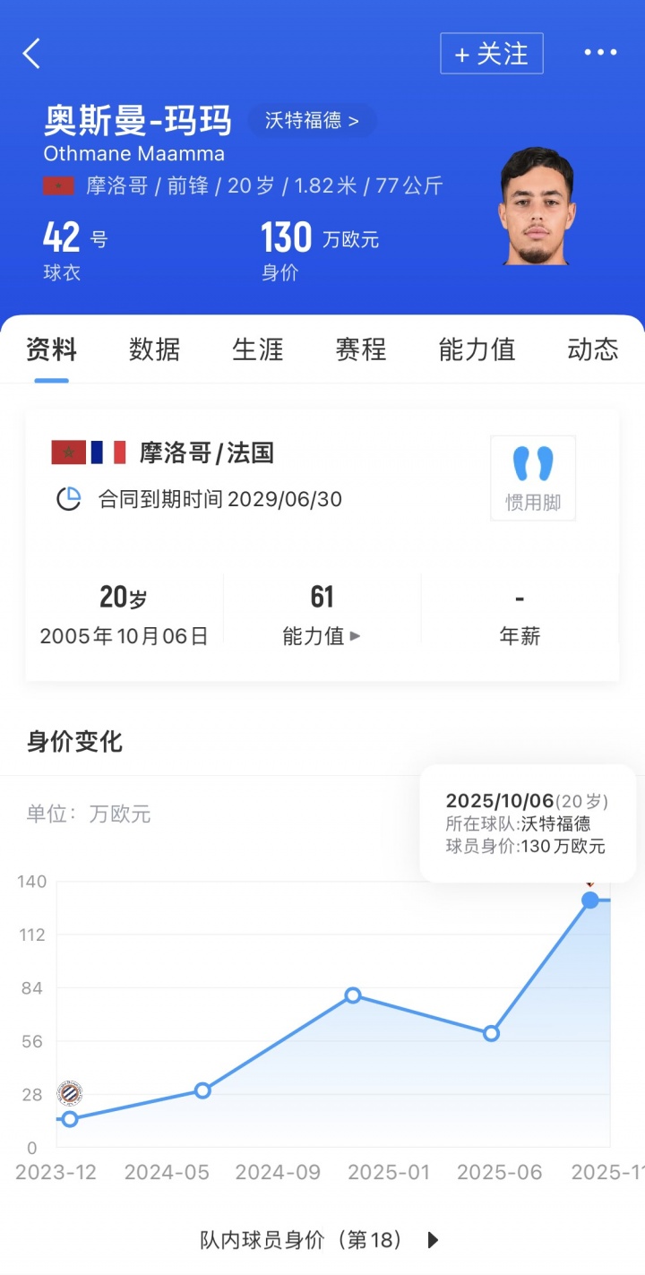 奥斯曼-玛玛当今身价130万欧。2024年普及至蒙彼利埃一线队,进入14场比赛,打进2球并有1次助攻。本年夏窗,沃特福德以130万欧的价钱签下了他,但球员尚未在英冠获取出场契机。