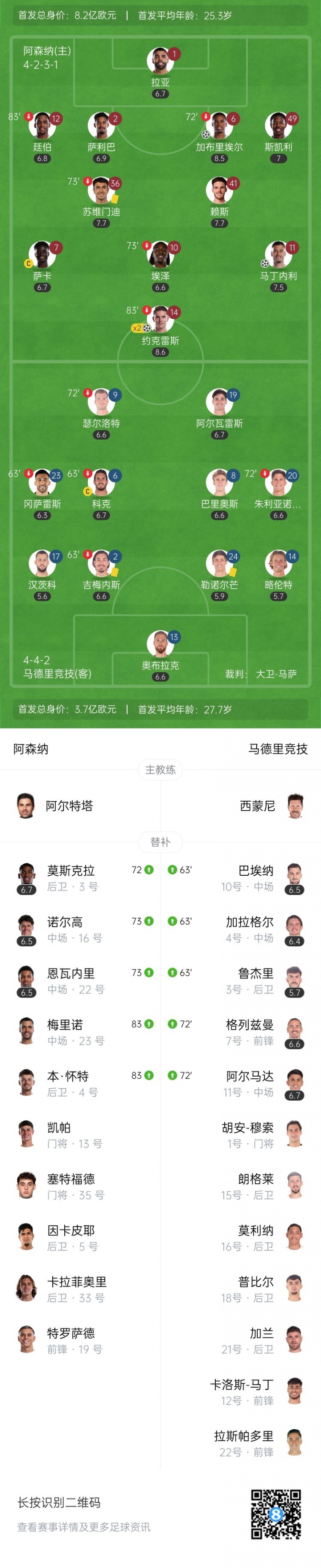 10月22日讯 马竞本轮0-4遭阿森纳横扫,西蒙尼在第63分钟作念了一次连换3东谈主的调节,巴埃纳、加拉格尔、鲁杰里上场,换下吉梅内斯、冈萨雷斯和科克。