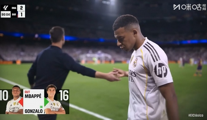 10月27日讯 皇马vs巴萨第90分钟,姆巴佩被贡萨洛换下,全场饱读掌。姆巴佩下场后与贡萨洛以及阿隆索击掌请安。