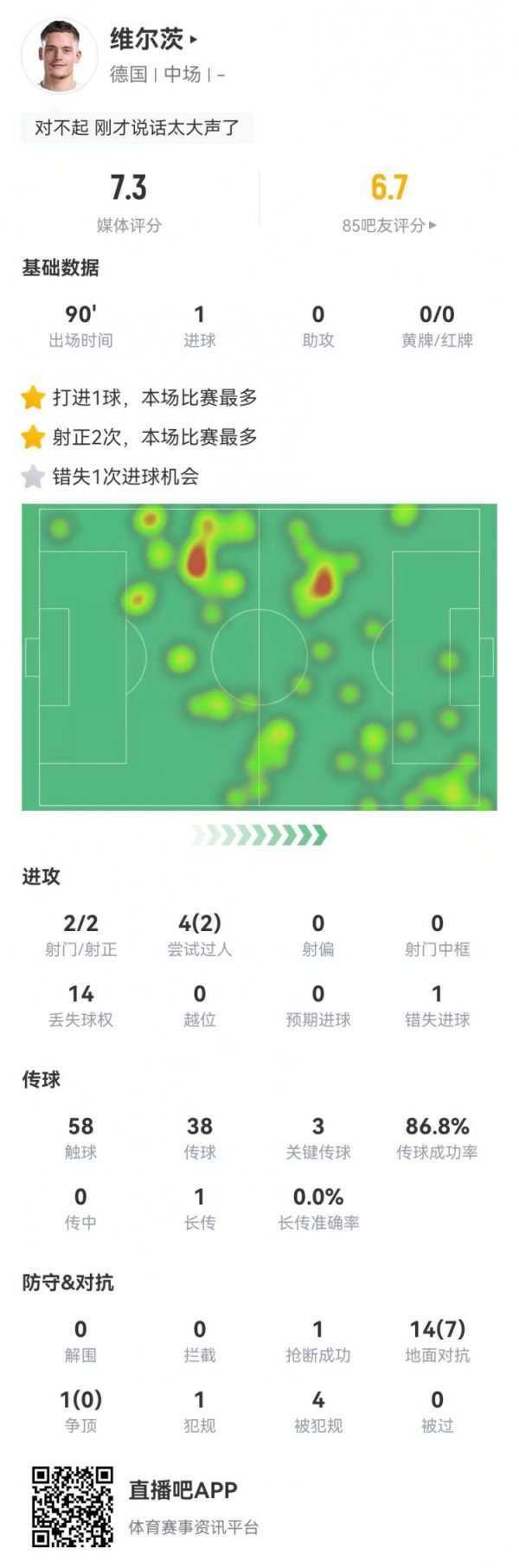 维尔茨本场2射2正进1球+1失良机 3要害传球4造犯规+15反抗7见效