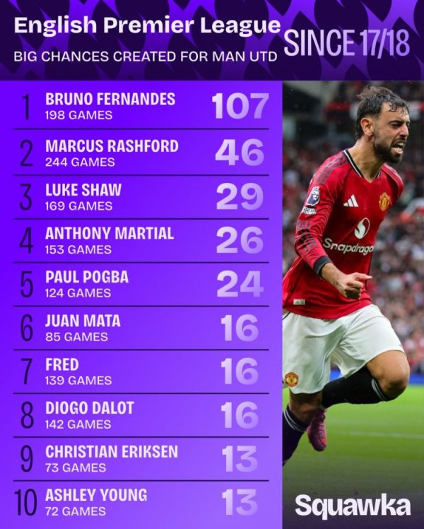 107次!自17/18赛季之后,B费是曼联在英超创造绝佳契机最多的球员