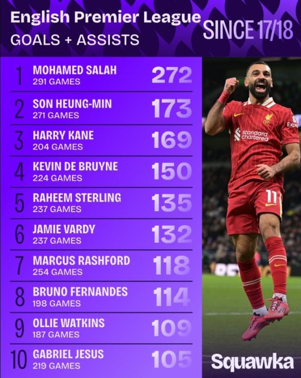 同时断层超越!17-18赛季以来,萨拉赫英超291场告成参与272球