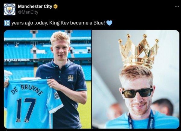 传说初始,曼城官推晒照:10年前今天,国王德布劳内成为球队一员