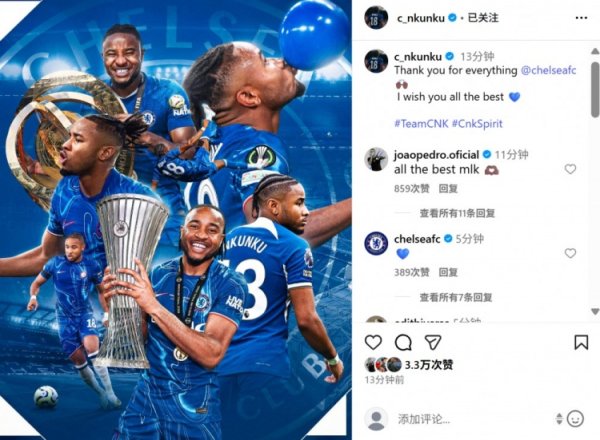 8月30日讯 27岁先锋恩昆库认真加盟AC米兰,球员也在个东说念主社媒晒出在蓝军本事的一些高光时刻告别球队。 恩昆库社媒写说念:“感谢切尔西俱乐部所作念的一切,为你献上最好意思好的祝颂!”......查看更多