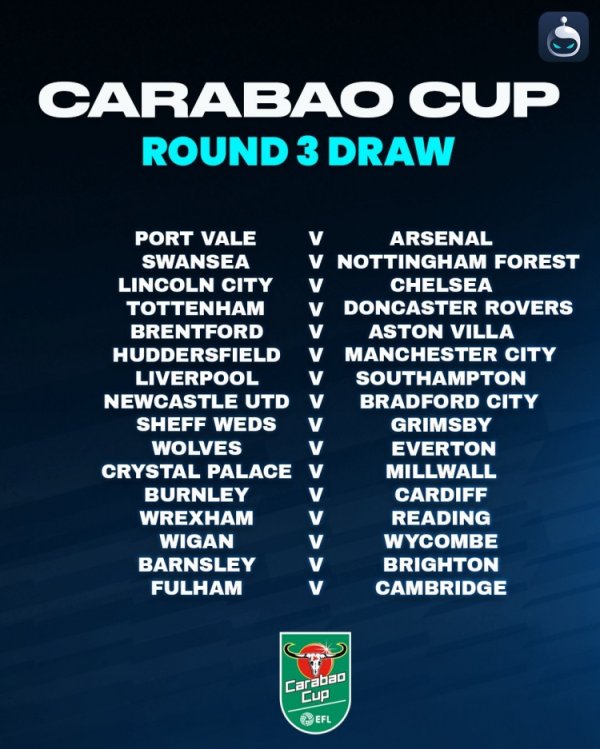 8月28日讯 英格兰联赛杯第三轮抽签效劳揭晓,具体如下: 维尔港 - 阿森纳 斯旺西 - 诺丁汉丛林 林肯城 - 切尔西 托特纳姆热刺 - 唐卡斯特流浪者 布伦特福德 - 阿斯顿维拉 哈德斯菲尔德 - 曼城 利物浦 - 南安普顿 纽卡斯尔联 - 布拉德福德城 谢周三 - 格里姆斯比 狼队 - 埃弗顿 水晶宫 - 米尔沃尔 伯恩利 - 加的夫城 雷克瑟姆 - 雷丁 维冈竞技 - 韦康比流浪者 巴恩斯利 - 布莱顿 富勒姆 - 剑桥联......查看更多