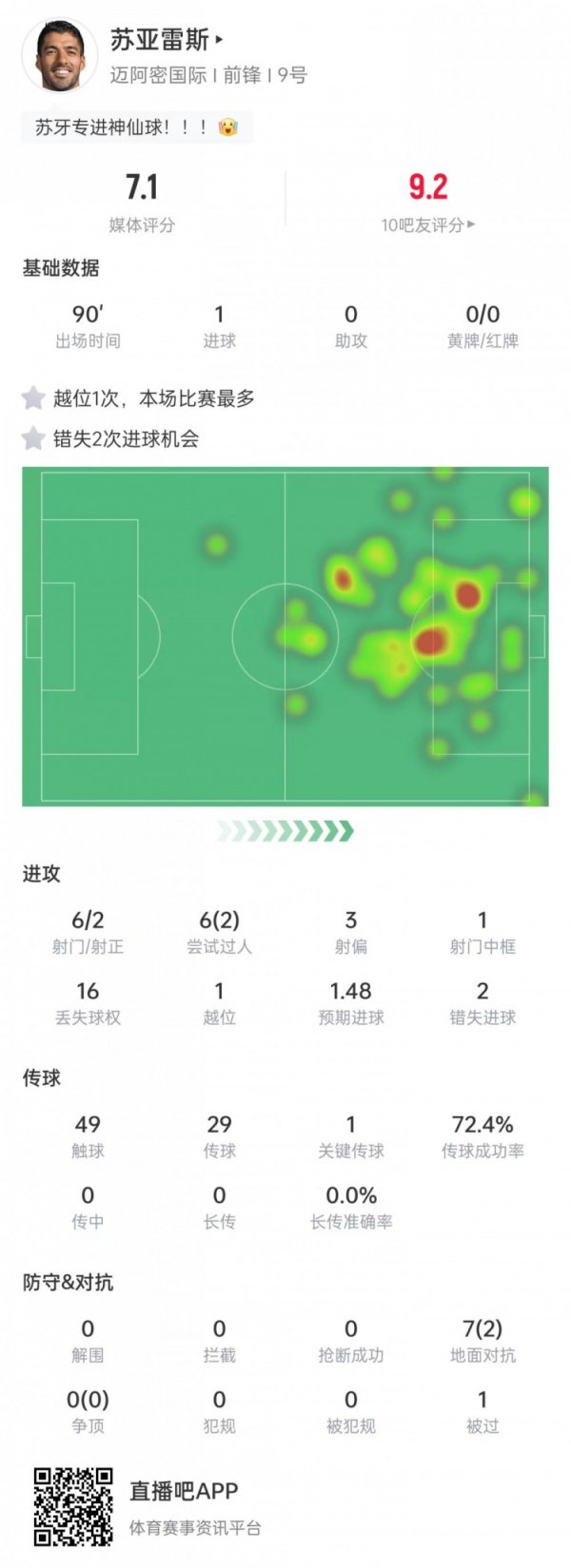 生存第600球!苏牙数据:6次射门2次射正,错失2次契机,评分7.1
