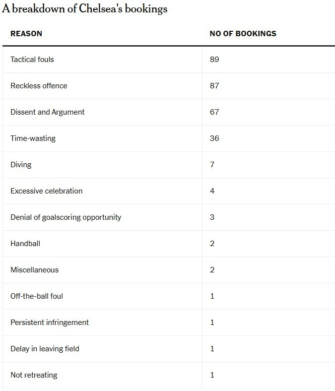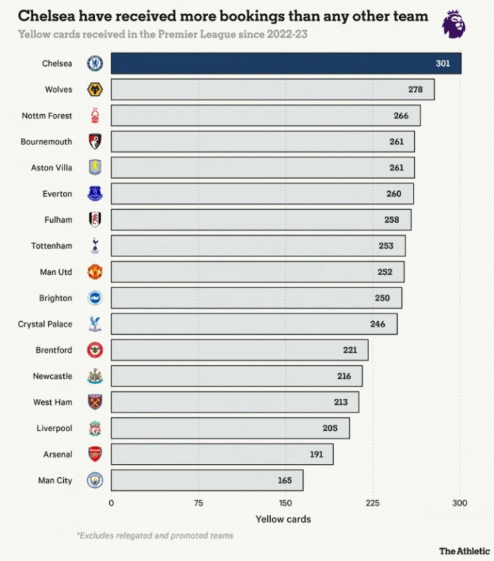 永州足球 2022-23赛季以来, 切尔西英超吃到301张黄牌远超其他球队