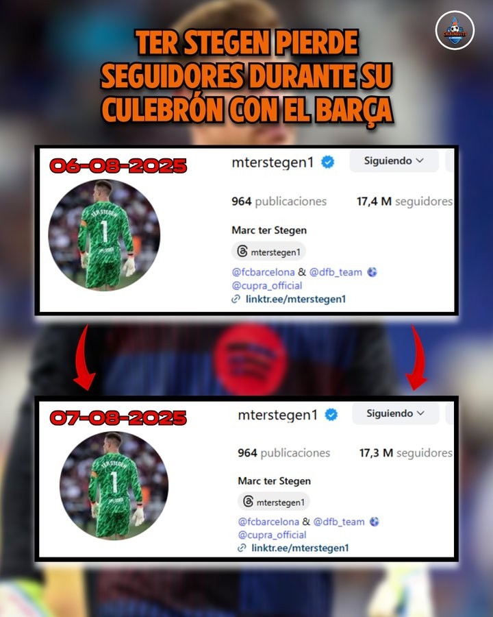 直播吧08月07日讯特尔施特根与巴萨之间的突破愈演愈烈,据西班牙六台音书,特尔施特根的社媒在一天内掉了10万粉丝。