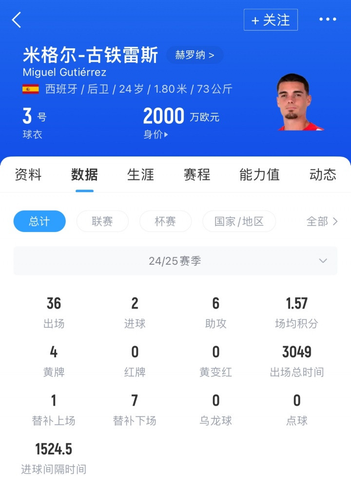 上赛季,古铁雷斯为赫罗纳出战36场,得到了2粒进球和6次助攻,当今其德回身价为2000万欧。