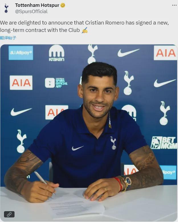 官方:热刺告示续约罗梅罗,两边签下了一份2029年到期的合同。