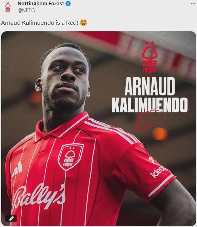 官方:诺丁汉丛林告示从雷恩签下了卡利穆恩多,两边签下了一份5年合同。