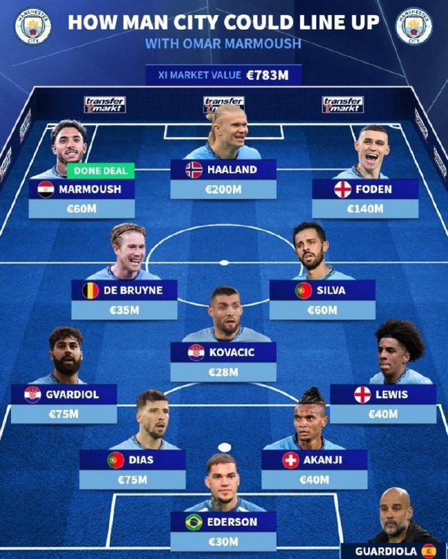 前卫线上,有刚加盟的马尔穆什(6000万),搭档哈兰德(2亿)、福登(1.4亿)。中场有德布劳内(3500万)、科瓦西奇(2800万)和B席(6000万)。后防地由格瓦迪奥尔(7500万)、鲁本·迪亚斯(7500万)、阿坎吉(4000万)、刘易斯(4000万)镇守。门将位置则是埃德森(3000万)把守。