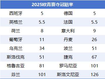 关系机构为本届赛事开出了夺冠赔率,其中西班牙、德国均为1赔5,英格兰、法国均为1赔5.5,四支球队数据收支无几,构成第一争冠集团;而荷兰1赔8、意大利1赔9、葡萄牙1赔11变成第二梯队,余下球队均已提升1赔25。