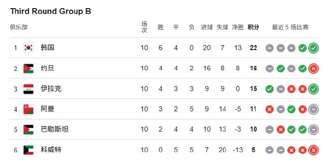 B组的韩国和约旦相同是提前晋级天下杯决赛圈,伊拉克在临了一场比赛中打败了约旦,最终排行小组第3,得到了附加赛履历。而阿曼通过点球绝平巴勒斯坦,拿下B组临了一个附加赛席位。巴勒斯坦错失好局,同科威特沿途被淘汰出局。