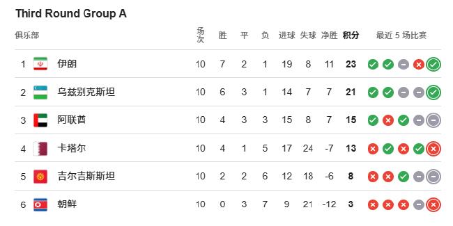 3个小组当中,A组的悬念首先斥逐,第9轮比赛事后就已尘埃落定。最终伊朗23分、乌兹别克斯坦21分,两队联袂晋级天下杯决赛圈,阿联酋15分、卡塔尔13分需参加下阶段的附加赛,吉尔吉斯斯坦、朝鲜被淘汰。