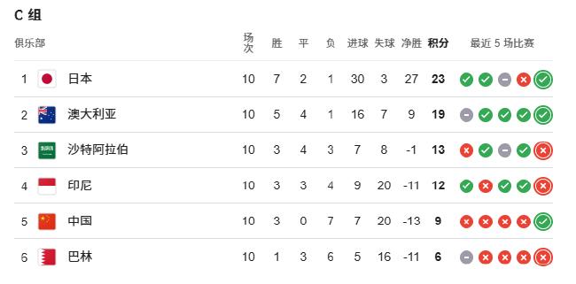 国足所处的C组,日本、澳大利亚分列前两名,拿到了纵贯好意思加墨的门票,沙特13分、印尼12分需要参加附加赛。而国足和巴林提前1轮细目无缘出线,在收官之战中,国足凭借小将王玉栋的点球绝杀1-0打败敌手。