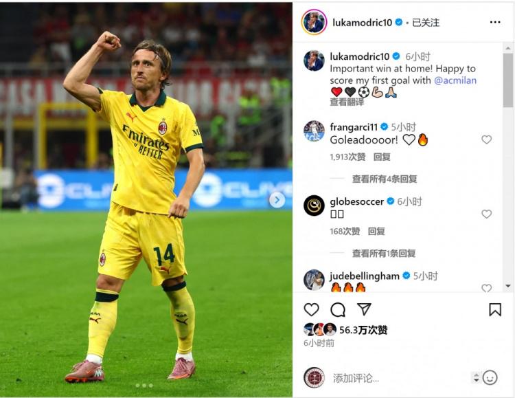 莫德里奇社媒晒出比赛相片,并写谈:“在主场获取蹙迫告成!很本旨攻入我在米兰的首粒进球。”