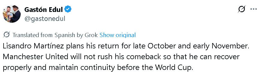 曼联在曼彻斯特德比中失利后,阿根廷队跟队记者加斯顿·埃杜尔显现,利马咫尺决议于10月底或11月初回来,曼联不得不聘请耐性的气派,确保他大概平时康复。这并不令东谈主偶然,因为利马的伤病记载并不顺眼。