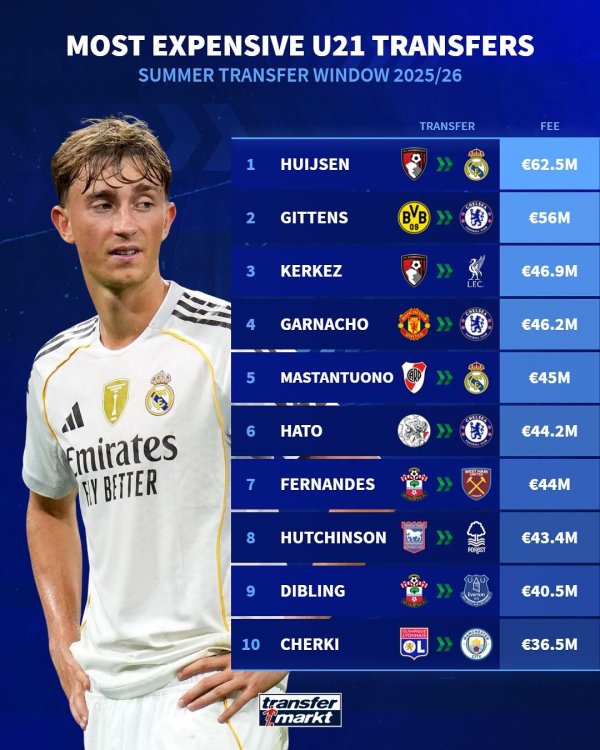 本赛季夏窗U21球员转会费TOP10:赫伊森6250万欧标王