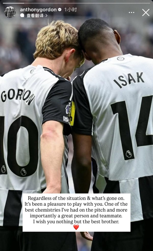 安东尼-戈登告别伊萨克:伯仲,只愿你改日一切奏凯