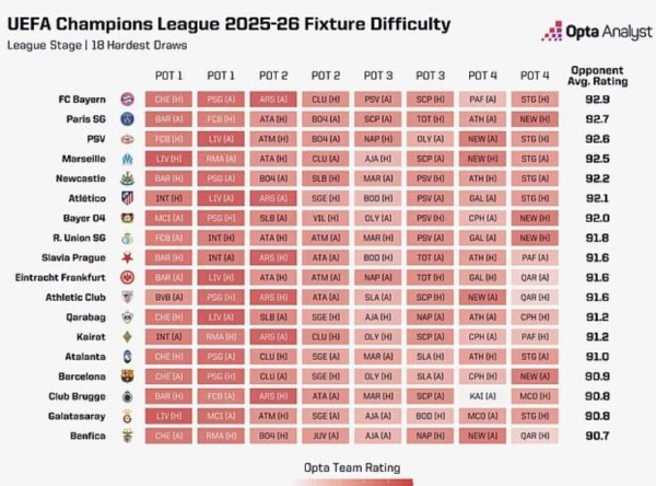 Opta超等计较机:拜和睦巴黎欧冠赛程重荷,枪手热刺赛程友好