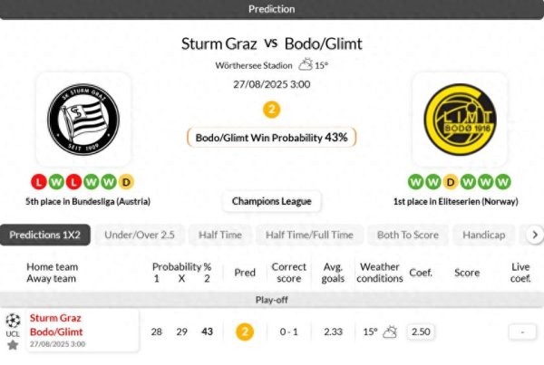 《国际谍报》为全球带来周二欧冠赛场的国际音问 格风暴vs博德精通 天气:阴天,15℃ 比赛形态:沃尔特湖球场 比分:负,0-1 格拉茨风暴(Sturm Graz) - In Sturm Graz's last 4 home Champions League games have been scored under 2.5 goals. 在最近4场欧冠主场比赛中,格拉茨风暴的比赛中总进球数均少于2.5球。 博德精通(Bodo/Glimt) - In their last 7 g......查看更多