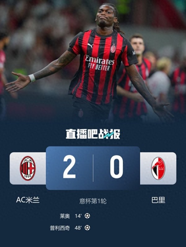 直播吧8月18日讯 北京技术8月18日凌晨3时15分,2025-26赛季意大利杯第1轮在圣西罗球场张开角逐,AC米兰主场迎战巴里。上半场莱奥先拔头筹+伤退,托莫里助攻,普利西奇中框,下半场普利西奇扩大比分,莫德里奇和亚沙里替补迎米兰正赛首秀。最终AC米兰主场2-0慑服巴里赢得新赛季开门红,米兰缓慢晋级意杯第2轮。 【比赛重要事件】 米兰率先!莱奥破门!第14分钟,托莫里右路传中,巴里后卫顶东说念主不紧,莱奥空位头球破门,AC米兰1-0巴里!↓ 莱奥伤退!莱奥进球后出现伤情,被......查看更多