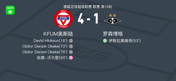 KFUM奥斯陆4-1大捷罗森博格,Obilor Denzel Okeke两球,David Hickson破门