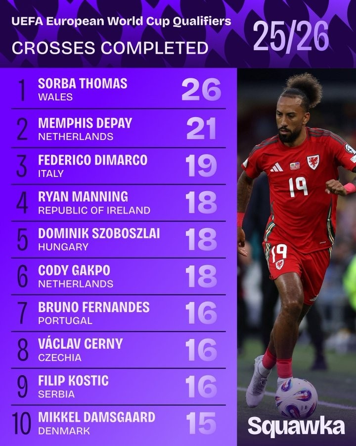 11月20日讯 本届世欧预小组赛还是告一段落,squakwa也统计了本届赛事成效传中情况,威尔士边锋索尔巴·托马斯领跑。