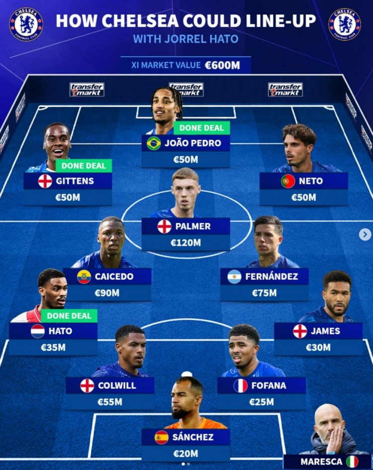 德转臆想切尔西新赛季声势:新援若昂-佩德罗、哈托、吉滕斯在列
