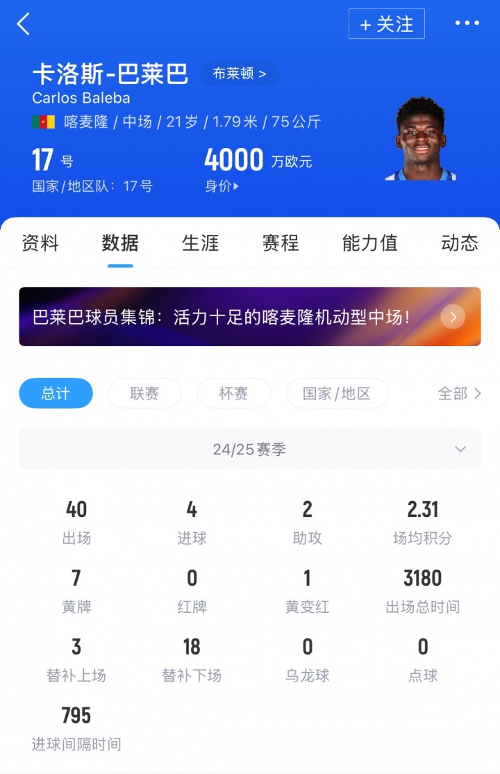 巴莱巴上赛季各赛事为布莱顿出场40次,孝敬4球2助,这位21岁的喀麦隆中场现在德回身价为4000万欧元。