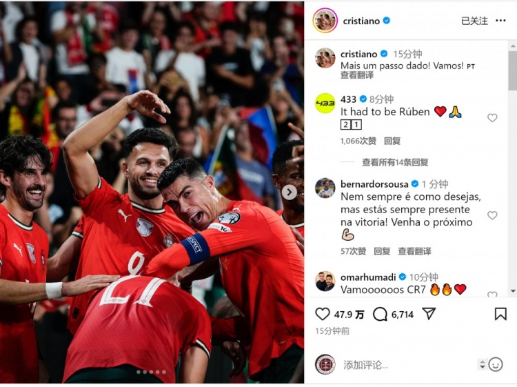 打败爱尔兰!C罗社媒晒照庆祝到手:又迈出一步,加油!