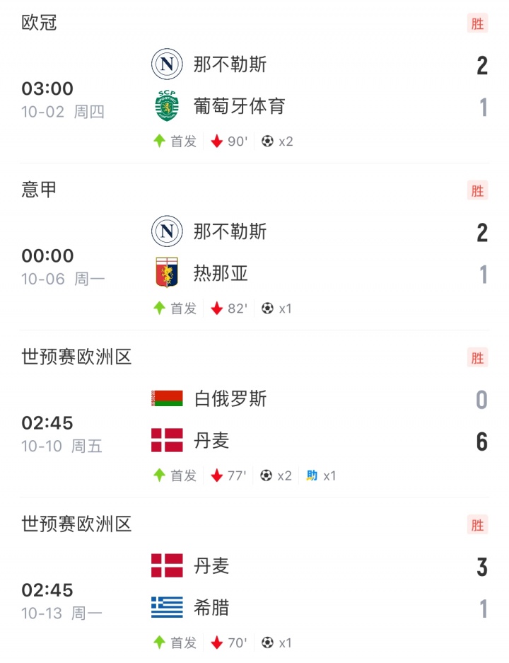 霍伊伦今夏从曼联租赁至那不勒斯,新赛季气象火热,各赛事为那不勒斯出战6场打进4球,国度队方面则已4场造5球(4球1助)。