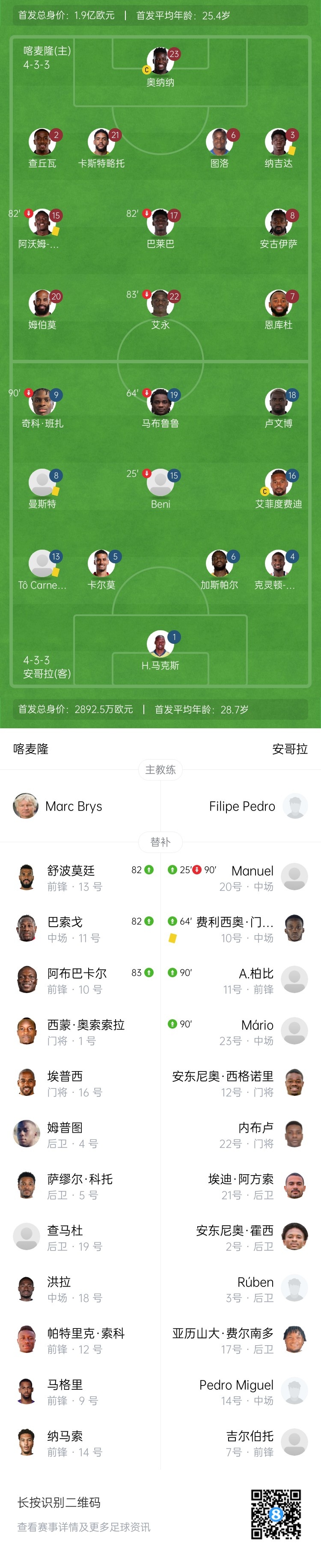 此役,喀麦隆派出的首发阵立足价高达1.9亿欧,姆贝莫、奥纳纳、安古伊萨、巴莱巴等球星整个首发。而敌手安哥拉首发身价不到2900万欧。