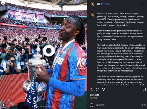 8月24日讯 转会阿森纳的埃泽更新社媒告别水晶宫。 埃泽:五年光阴,恍如昨日。从我踏入水晶宫大门的那一刻起,你们给了我罢了英超梦念念的契机,让我为南伦敦最大的俱乐部着力。从一初始,我就设定了计划,念念要在这里有所设置,但从未念念到这五年会如斯精彩。 东谈主们称咱们为“家庭俱乐部”,因为除非你身在其中,不然很难信得过相识成为这个各人庭一员的嗅觉。他们说的没错。再行冠疫情的挑战,到我跟腱扯破后的漫长规复期,再到我在塞尔赫斯特对阵维拉时复出的阿谁夜晚,直到今天,你们对我的爱和援手,......查看更多