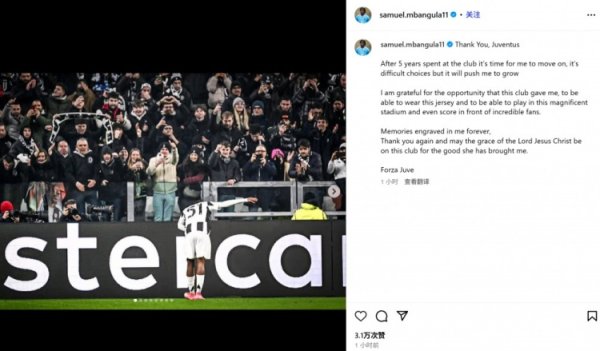 姆班古拉社媒告别尤文:遵守5年后离队是竭力遴荐,但我需要成长