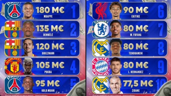 法国球员历史转会费榜:姆巴佩领衔4东谈主过亿 埃基蒂克第6&皆祖第10