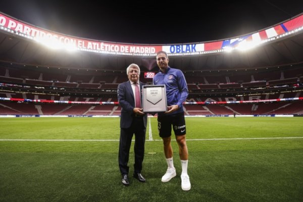 奥布拉克代表马竞出战500场里程碑,塞雷佐为其颁发操心牌匾
