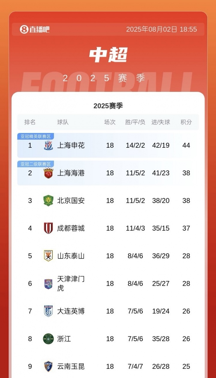 申花在积分榜积44分逾越排行第9的玉昆19分,但玉昆凭借高原主场上风已赢得主场五连胜,此刻申花半场1-3落伍。