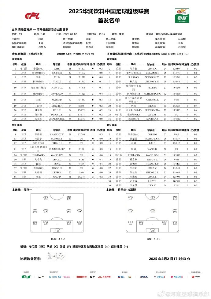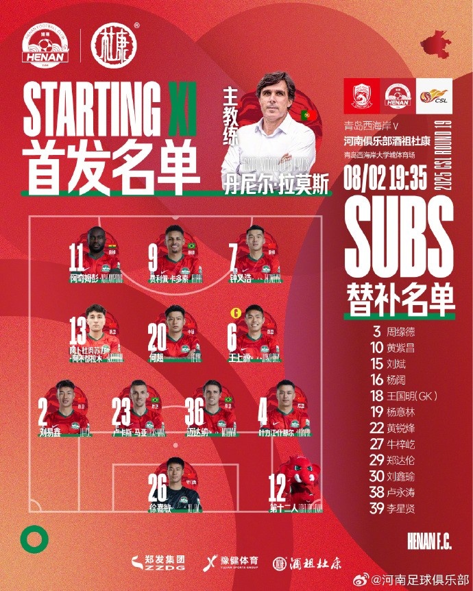 中超第19轮青岛西海岸VS河南俱乐部酒祖杜康 首发及替补队员名单