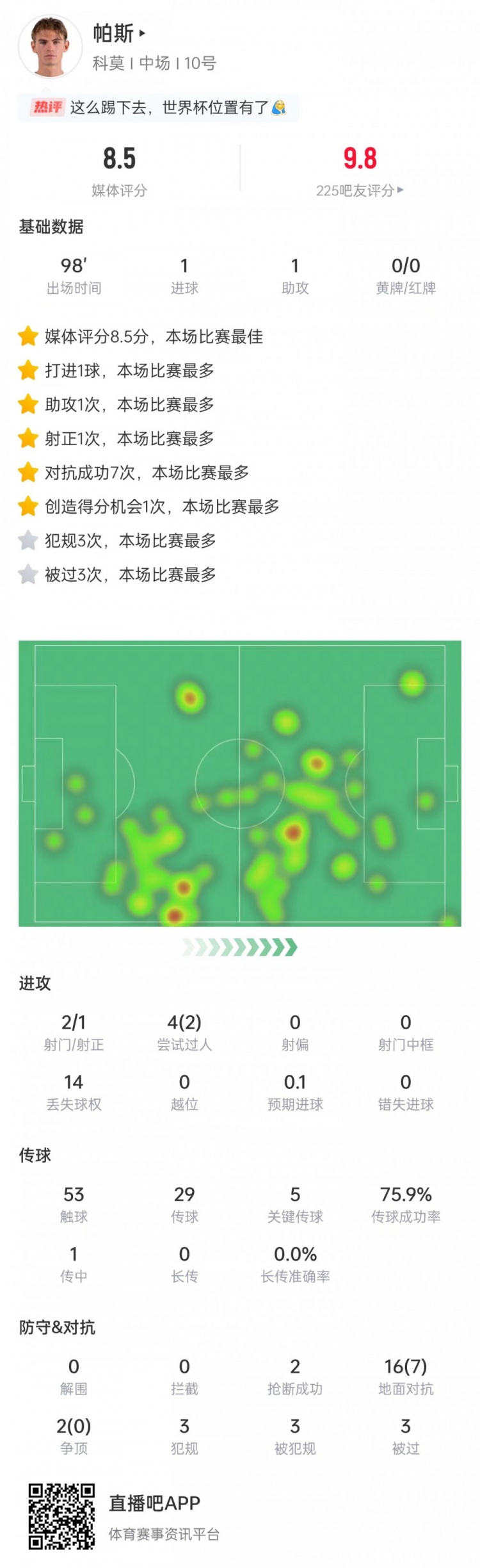 帕斯本场数据:传射立功+5次要害传球,获评8.5分全场最高