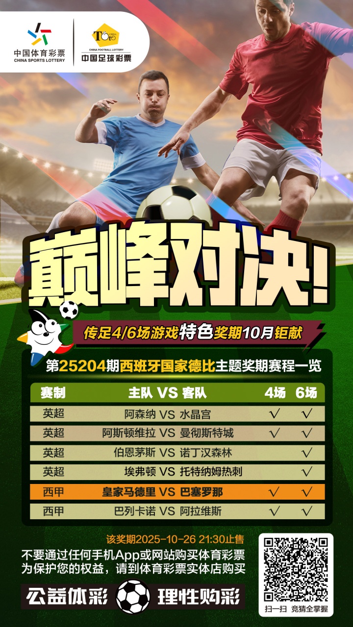 第25204期传足4/6场游戏特点奖期依然于2025年10月22日20:00开售,将于2025年10月26日21:30停售,并于10月27日开奖,其中阿森纳VS水晶宫、阿斯顿维拉VS曼彻斯特城、皇家马德里VS巴塞罗那和巴列卡诺VS阿拉维斯为4场进球游戏竞猜赛事。