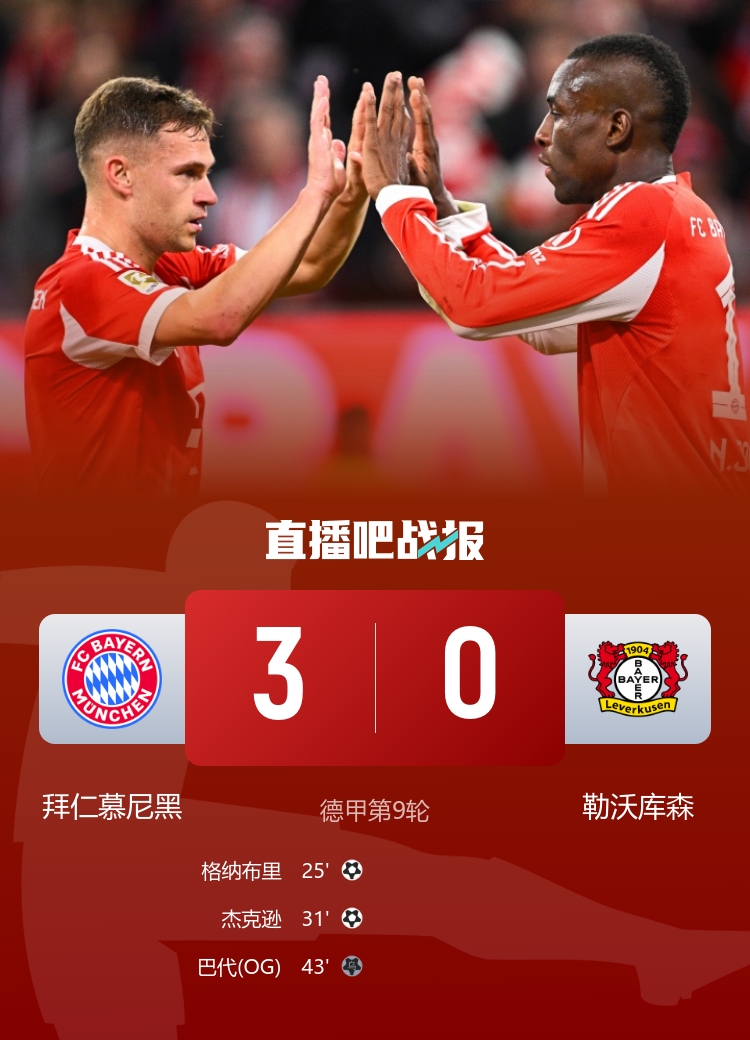 拜仁瓜代声势3-0轻取勒沃库森,球队延续开季以来的无解战绩,新赛季于今一经各赛事15连胜!